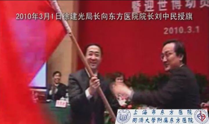 这是前WHO总干事陈冯富珍在瑞士办公室亲自为我们授旗,并在第九届全球健康促进大会召开期间,专程来东方医院观摩指导队伍演练。